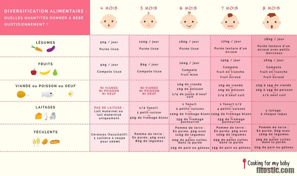 Quel quantité de purée pour un bébé ? Entre 7 mois et 8 mois Vers 7 à 8 mois, bébé consomme toujours des céréales infantiles avec gluten, 4 à 5 cuillères à café rases dans ses biberons du matin et du soir Il peut aussi commencer à manger des céréales au goûter, sous forme d'un biscuit pour enfant en bas âge à texture fondante Il est possible d'utiliser de la farine de blé classique ou de la semoule fine pourUne règle d'or Le lait continue d'être l'aliment prioritaire pour votre enfant jusqu'à un an Les aliments ne doivent pas gâcher son appétit pour le sein ou le biberon Il doit boire au moins 750 ml par jour jusqu'à 9 mois et 600 ml par jour jusqu'à 2 ans Si vous l'allaitez, offrezlui toujours le sein avant son repas solide, au moins jusqu'à 7 mois